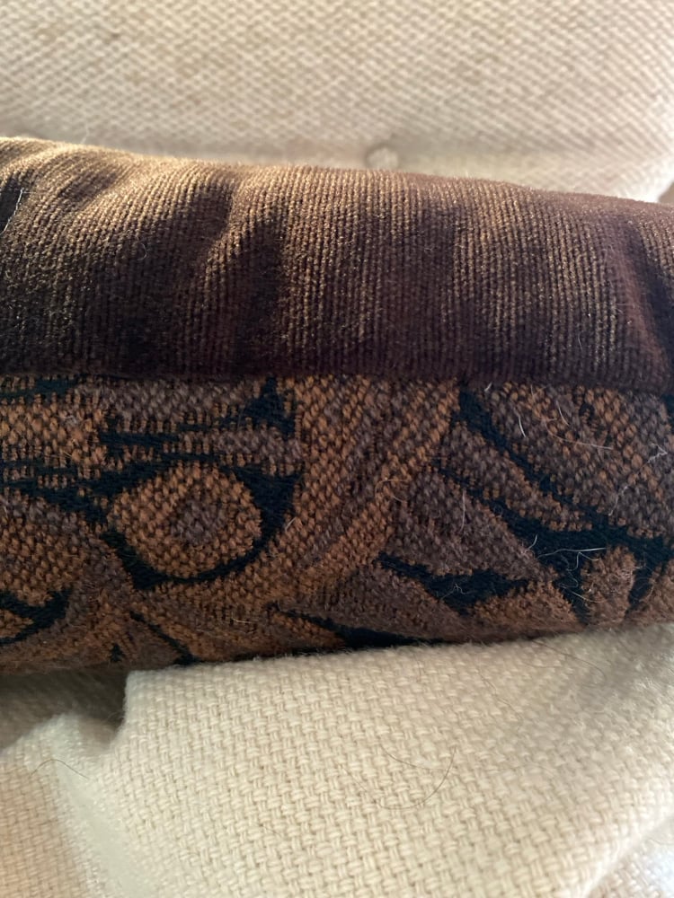 Coussin en tapisserie de laine sur une face et en velours ras marron sur l’autre face.